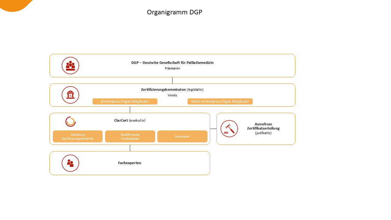 | Fachgesellschaft | Die Deutsche Gesellschaft für Palliativmedizin (DGP) ist der Initiator und Gestalter für die Zertifizierungssysteme. Die DGP gibt die Politik und Ausrichtung für die Weiterentwicklung dieser Zertifizierungssysteme vor. Die Aufgaben der DGP liegen weiterhin in der Rechte- und Mandatsvergabe der Zertifizierungssysteme. |